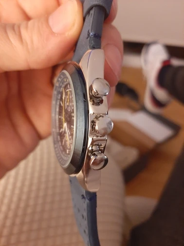 Stainless steel case with a blue (polyurethane-coated) leather strap (with yellow backing).