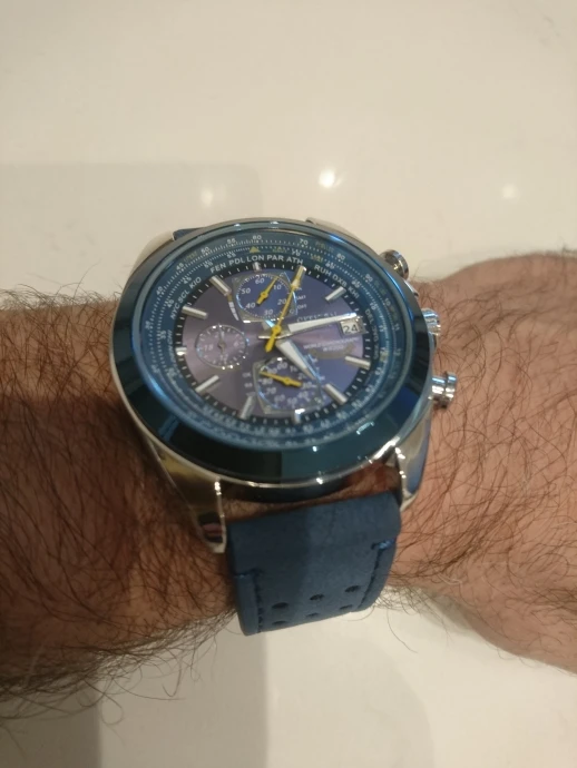 Blue dial with luminous hands and index hour markers.